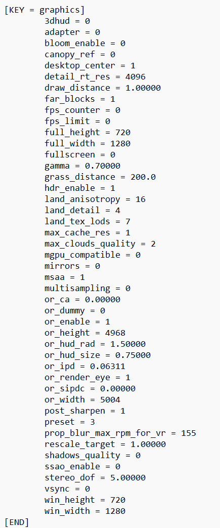 DBCOOPER011 Posted November 16 Posted November 16 (edited) Thanks for the info, its very helpful. Also using a Pimax Super/5090 but with a 9800X3D This narrow FOV mode is pretty sweet on the Pimax Super, but I wish they included adjustments for the vertical resolution. I tried using the vertical offset of +1.2 in conjunction with the narrow mode, and it brought my resolution to 5004x5400ish. I wasn't able to lower the vertical resolution any further by moving the vertical offset. Moving it up or down just increased the vertical resolution. I also got a little eye strain from it for some odd reason. The HMD is way too bright and I had to lower the brightness tremendously. I'm using the narrow mode and cropping the vertical resolution in OpenXR toolkit with Crop2FOV. The resolution I'm using now is 5004x4968 with no upscaling. I'm Running 72hz, Pimax sharpening at 1.0, with the below settings. My average frame time on a Rhineland QMB mission is 10ms and the picture quality/spotting is extremely good. It takes a while to get Pimax HMD's adjusted to your face and setup correctly, but well worth it. Edited November 16 by DBCOOPER011
