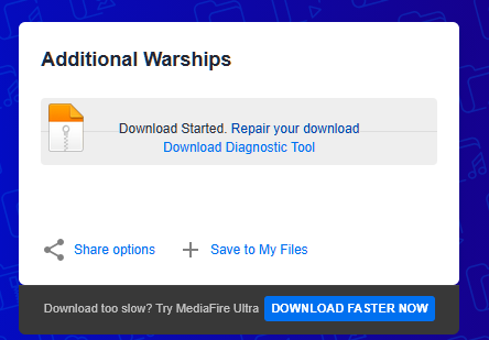 Stonehouse Posted October 2 Author Posted October 2 7 hours ago, jollyjack said: Hi Stonehouse, i am getting errors downloading from mediafire, they got some new scam LoL, and i am a legit user registered for ages there. ADDED, i used palemoon browser now, and it seems a little better, 50 minutes download time for the 338 MB file I use edge or chrome and when downloading from mediafire I click on the link, see a mediafire webpage open, almost immediately I get a pop up which I close straight away. I find that regardless I now have a download either happening or waiting for me to nominate where I want to save it (based on browser settings). The mediafire webpage however also displays a similar thing to what you say. I just ignore it. If it really starts to act up badly, I'll look for another host, I only have two mods uploaded to mediafire. Flak generators and Additional warships. 1