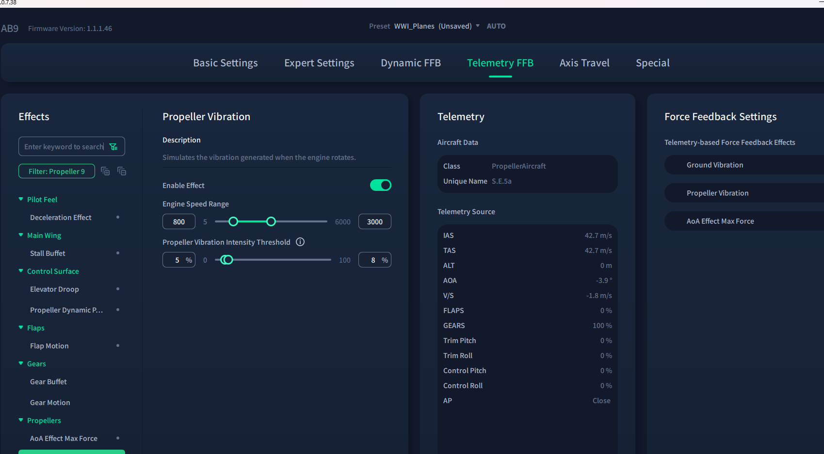 Wruin Posted Saturday at 04:01 AM Posted Saturday at 04:01 AM (edited) With the current sale on Steam - and as someone who loved Rise of Flight - I decided to finally purchase all the Flying Circus DLC. Excited to revisit the WWI experience, I grabbed my FFB joystick and jumped in. Immediately I knew something was off - the joystick was violently jerking all around whilst intensely vibrating, and I hadn't even started my engine!? No matter what WWI airplane I jump into, I get the exact same behavior; something that hasn't happen with any of the WWII aircraft that I've flown but happens for every single WWI aircraft. What I noticed? "Ground Vibration" Telemetry FFB data is constantly being sent to the joystick; the same telemetry FFB data that is sent when landing! I can provide you with a lot more screen shots, but it should be something pretty easy to debug... Edited Saturday at 04:04 AM by Wruin Capitalize 'V' in vibration :/ 1