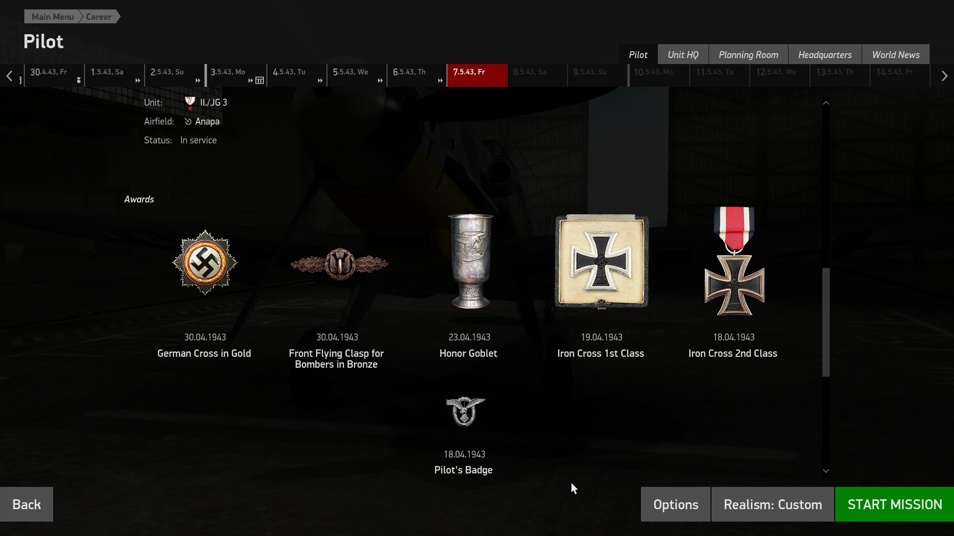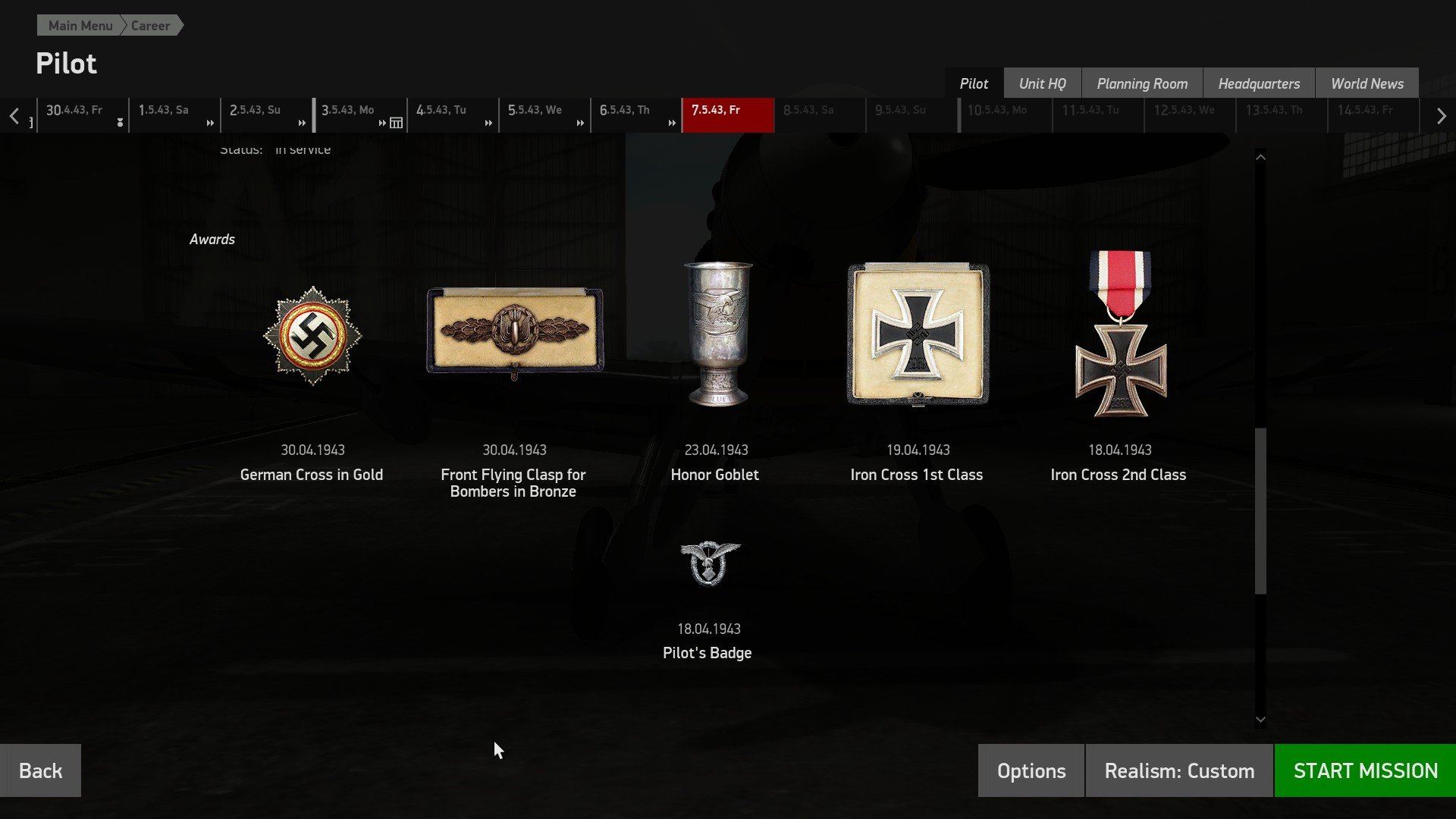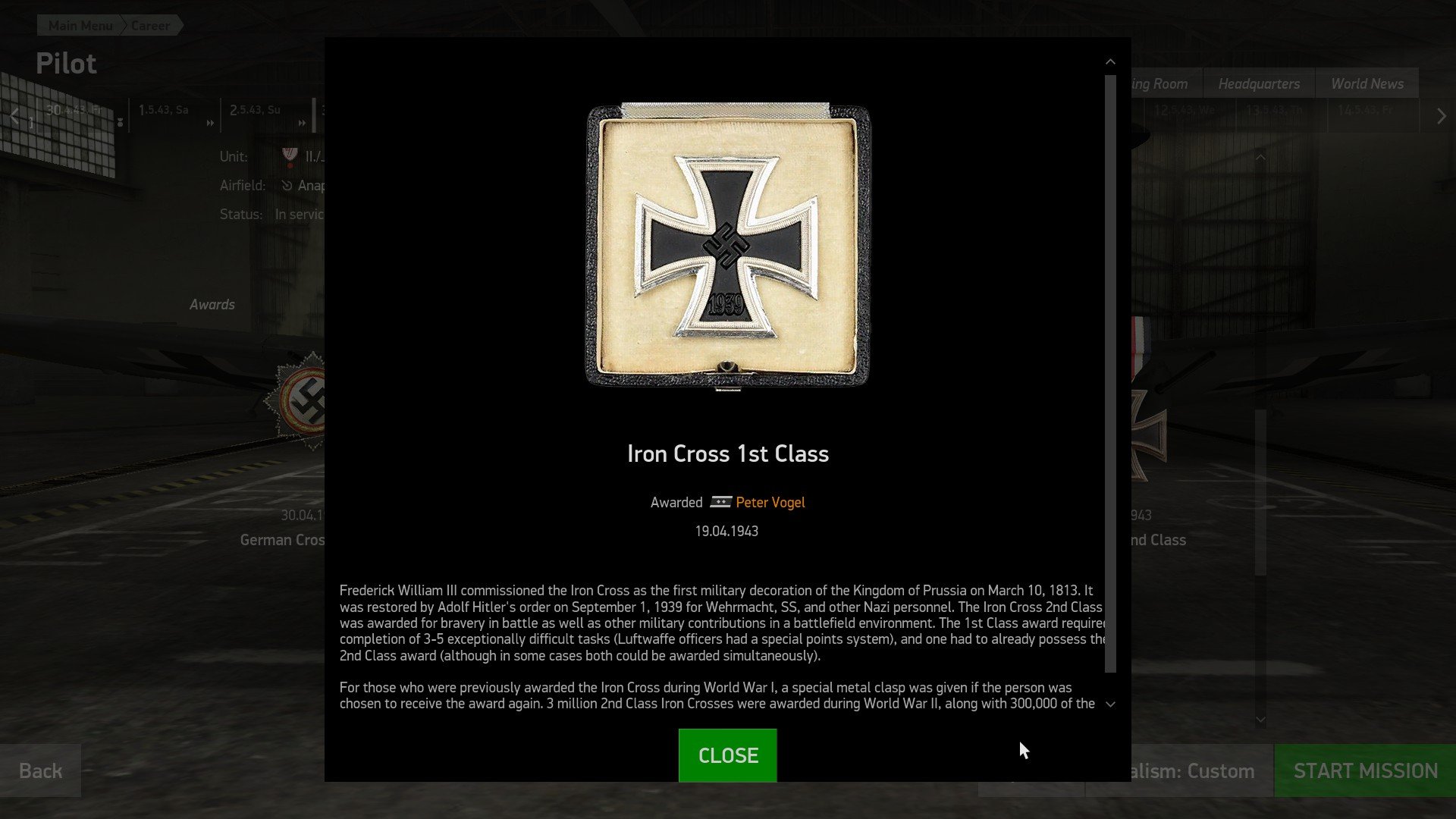 Aurosa Posted Thursday at 07:24 PM Posted Thursday at 07:24 PM (edited) At the moment awards just float in the air on the screen, after I'm done, you will have them in an etui, everything historically and period accurate. Once rewarded, soldiers were then able to purchase that item. In general, we could divide some of the awards/medals into two categories, and that is soft/solid, that is not by any means official, but to an ordinary person it will make things way easier. Soft is the type of item that could have been then sawn onto the uniform, while the solid (metal - or basically any other alloy type) is the type that the soldier was usually given. If you are into immersion, then you can pretend like your uniform has all the cloth type awards sawn onto, and those in the box were sent back home to your parents, or any other reason you can think of. Today the same things happen, combat dress gets the cloth variants, while service gets the metal. ------------------ + Info + x Everything is a subject to change. x Iron Cross will be getting an update, I didn't create a topic about it being wrong, as there were many official producers of awards, and there are many variants of everything. I will go with the one that is just what it should be, rather than what is in the game. ------------------ + Released > including preview + 1. Frontflugspange. 2. Verwundetenabzeichen. 3. Der Kriegsorden Deutsches Kreuz + Flugzeugführer und Beobachterabzeichen (changed). ------------------ - There are two sets of rewards, 1st was fixed to include swastika, 2nd wasn't. I'm only updating the first set at the moment. - Medaille „Winterschlacht im Osten 1941/42” files are unavailable. ------------------ + Installation + 1. Download. 2. Unpack. 3. Go to: X:\...\Steam\steamapps\common\IL-2 Sturmovik Battle of Stalingrad\data\swf\il2\achievements\ place folders here. 4. Enjoy. ------------------ Any questions, complaints etc. feel free to write here, or send me a PM. ------------------ Spoiler frontflugspange.zip verwundetenabzeichen.zip dkdk + fub.zip Edited 1 hour ago by Aurosa 2