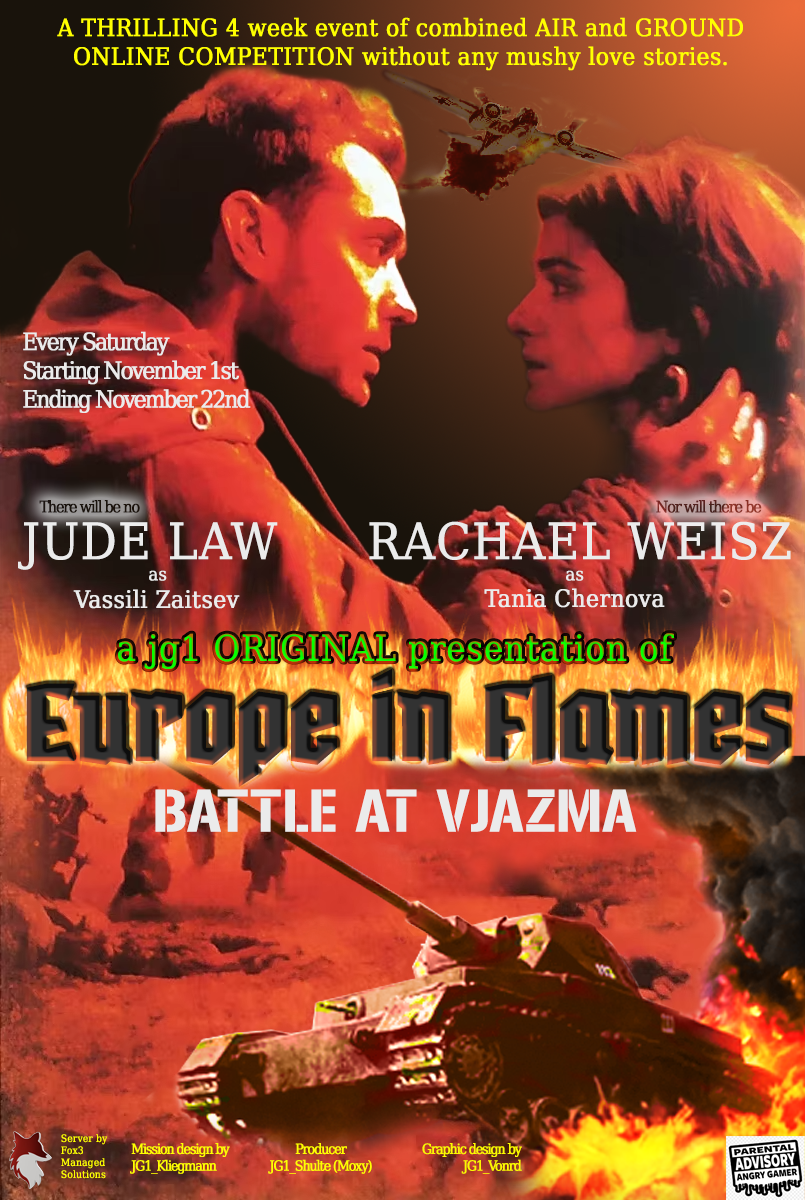 JG1_Vonrd Posted Tuesday at 02:52 AM Posted Tuesday at 02:52 AM The Enemy is at the Gate with Europe in Flames! Announcing JG1's newest WWII combined arms event where you can participate as an intrepid pilot or a steadfast tanker... or both! As fall is waning with the promise of winter's brutal conditions soon to come, the Russian forces are faced with a German thrust to capture the strategic town of Vyazma. If the Germans succeed, they will be well on the way to threatening Moscow. Both sides are steadfast in their resolve to accomplish their respective missions... the Germans to advance and encircle the Russians and the Russians to hold and inflict unsustainable losses on the Germans. This event is strictly player vs. player with the exceptions of AI supply columns, trains and the static defenses at the capture points. The success of this event is highly dependent on player participation. For maximin team play, tankers will be needed. Everything related to Europe in Flames (EIF) including voice comms will be through the EIF Discord which can be found here: https://discord.gg/4vPQyy4 Registration is mandatory and will stop 24 hours before each weeks mission start but we will make every attempt to include late registrations up to the server launch. We may be too overwhelmed though so don't count on just showing up at the last minute. We will not be allowing bulk registrations by squadron commanders (or any others for that matter) unless the person doing the registration can provide each and every individual's "Certainty of attending". Register through the EIF Discord at: https://discord.gg/4vPQyy4 Roles #registration Dates of the event will be every Saturday, Nov 1st, 8th, 15th and 22nd with combat starting at 11:00 AM San Francisco time (please convert to your local time since the clocks will be shifting). There will be no Dry Run but there will be practice missions running on our server in the weeks prior to event start. It is a Fox3 server (BIG shout out to Fox3!) with the mission title "battle of vjazma" or something similar. JG1 will be running practice Tues and Thurs at 6:00 PM San Francisco time and all are welcome. So, come join us! Sorry, Jude Law and Rachael Weisz won't be there and mushy love stories are unlikely. 1