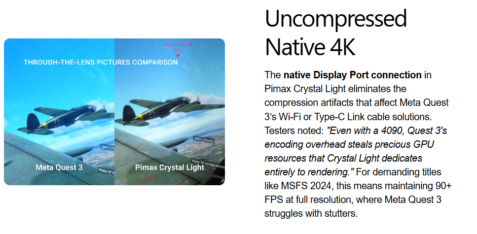 Calvin_Pimax Posted November 13 Posted November 13 On 11/6/2025 at 4:00 PM, chiliwili69 said: Marketing is the "science" to distort the reality without lieing, but frequently the red line is crossed. I was surprised with one of the marketing campaings of Pimax when they were comparing the Quest3 with the Crystal Light. Something I personally did on my own on June-2024, taking my own conclusions (keeping the Quest3!) and reporting them in this section. The funny thing is that they used the picture I took with my camera to compare them in IL-2, and they didn´t include any link to the original post to get the full story. The Pimax campaing is: https://pimax.com/pages/pimax-crystal-light-vs-meta-quest-3/ Firstly they are wrong with the Quest3 price, it is 499$ for the 512GB model. Here they talk about the image, and include that Heinkel picture I took to explain that compared to the Quest3, the PCL needs a huge amount of pixels to be better than Quest3, only slightly better: The link they didn´t include to that pictures is this: But the real funny thing is what they say in the right to my picture!!: "Even with a 4090, Quest3 encoding overhead steals precious GPU resources that Crystal Light dedicates entirely to rendering" LOL!! . They only need to add "to rendering a huge amount of pixels due to the fact that PCL has one of the worst render/panel ratios in the market" And later thet talk about the lenses: They are simply lieing. The Quest3 lenses offer a bright view of the scene, an extraordinary eye-box and no distortions. IMHO the best lenses I have tried from my 14 previous VR devices. In any case, I am a big fan of Pimax (to put PCVR at the center) and a big hater of Meta (for ignoring PCVR). But I had a big laugh with the above LOL!! Woah, that’s not good. I’m going to ask them to revise the article and make sure proper credit is given to whoever took those photos or shared those figures. 2