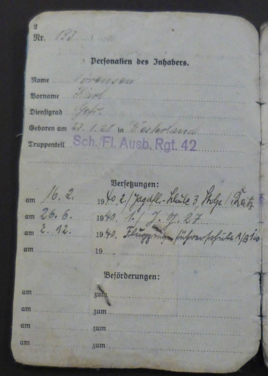 707shap_Srbin Posted November 10, 2013 Posted November 10, 2013 Ebay, 2 Flugbuch + photos + documents. Gefr Karl Sorensen LUFTWAFFEN - FLUGZEUGFUHRERLCHEIN - Pilots Licence INDIVIDUAL PHOTOGRAPH FLUGBUCH - Period - July 4th 1939 to May 9th, 1940 (A total of 402 flights) FLUGBUCH - Period - June 26th, 1940 to November 15th, 1940 (A total of 98 flights) Looks like he spent June-December 1940 with 1/JG-27. At time of Battle of Britian PERSONALAUSWEIS - Red Cross Pass - Issued 1 July 1943 PHOTO ALBUM: containing Aircraft / Training / Personnel / Family Photos - 34 Photos